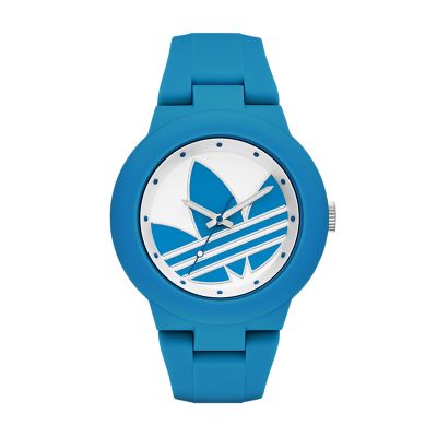 A matte blue silicone strap on the adidas Aberdeen watch lets the white-and-blue trefoil logo dial take center stage. This rugged, authentic watch has style for miles.
